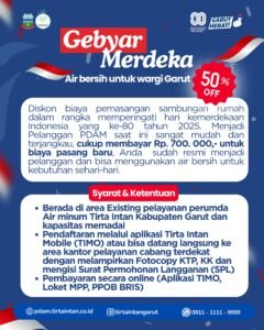 Nusahariamedia.com 01/07/25 -Dalam rangka memperingati Hari Kemerdekaan Republik Indonesia ke-80, PDAM Tirta Intan Garut menghadirkan program diskon 50% biaya pemasangan baru sambungan rumah (SR) untuk masyarakat Garut.