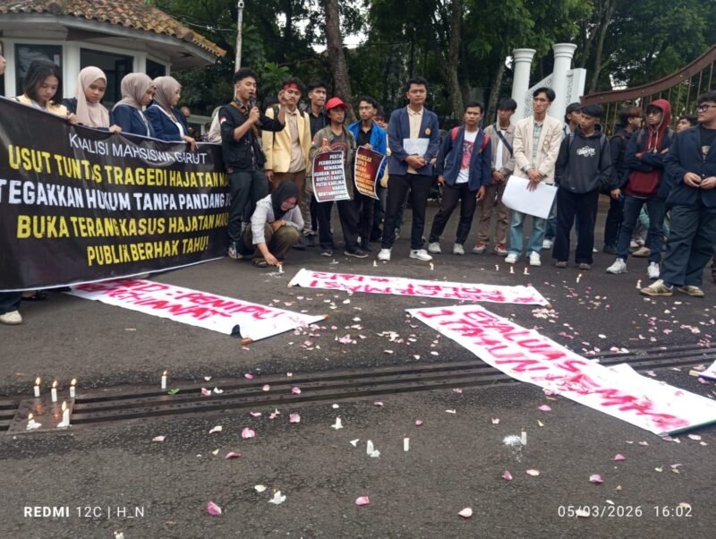 Nusaharianmedia.com 05 Maret 2026 – Koalisi Mahasiswa Kabupaten Garut menggelar aksi unjuk rasa di Alun-alun Garut sebagai bentuk evaluasi terhadap kinerja Pemerintah Kabupaten Garut dalam satu tahun kepemimpinan Bupati dan Wakil Bupati Garut. Aksi tersebut diikuti puluhan mahasiswa dari berbagai perguruan tinggi dan diwarnai dengan orasi serta pertunjukan teatrikal.
