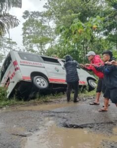 Peristiwa tersebut diduga terjadi akibat pengemudi menghindari kubangan jalan rusak, sehingga membanting setir dan kendaraan terperosok ke jurang sedalam sekitar 14 meter.